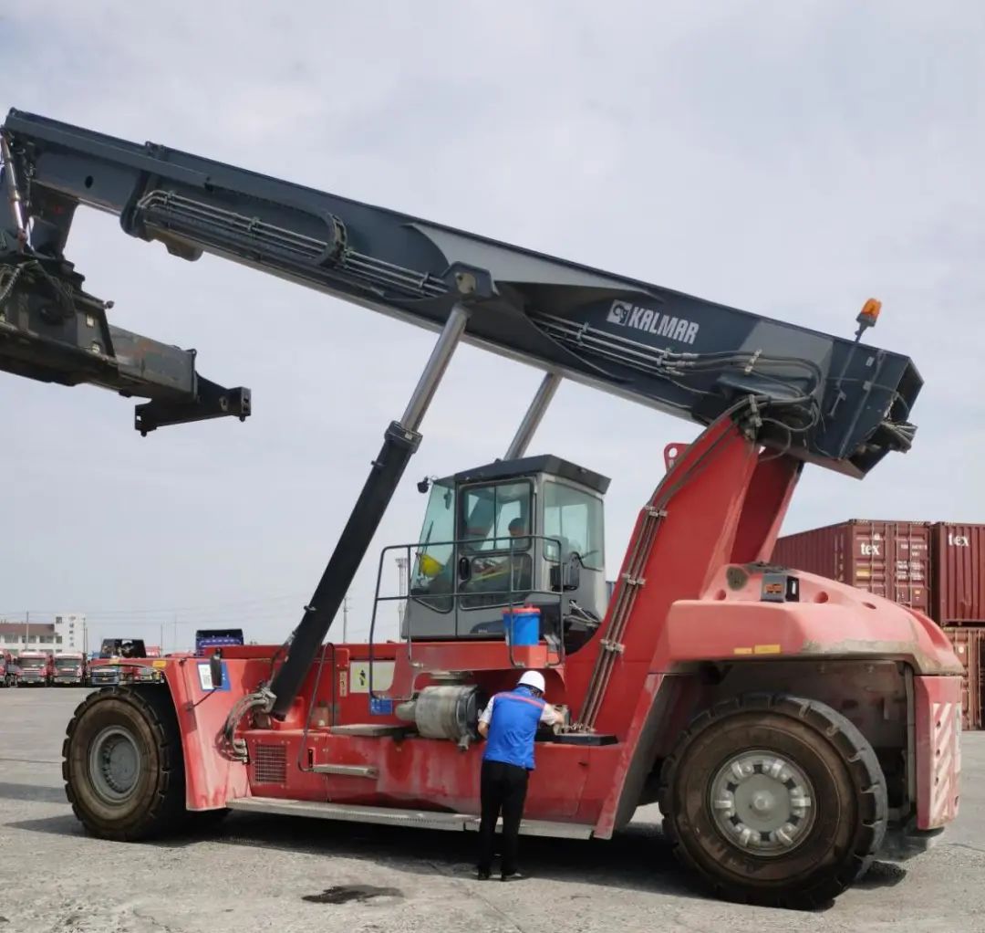 在今年4月初,大丰港区的一台卡尔玛堆高机因为电气故障抛锚,严重影响了正常的生产。港区维修人员第一时间联系售后单位,售后人员通过电话指导排查故障点,却迟迟不能找到原因,唯有进行现场检查排故。当时上海疫情严重,售后人员需要层层报备、审批、隔离后才能到达现场,漫长的等待期将严重影响集装箱的正常作业进度。此时现场维修人员打电话给倪旅军同志咨询其他故障时,偶然提到了这台机的问题,倪旅军同志知晓后立即驱车前往集装箱堆场了解故障情况。经过短短20分钟的现场排查,他成功找到并解决了堆高机的故障,使之能够正常作业。