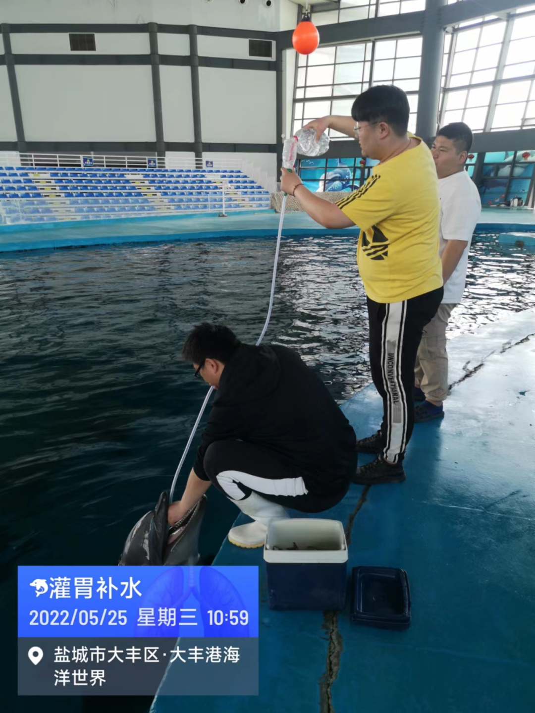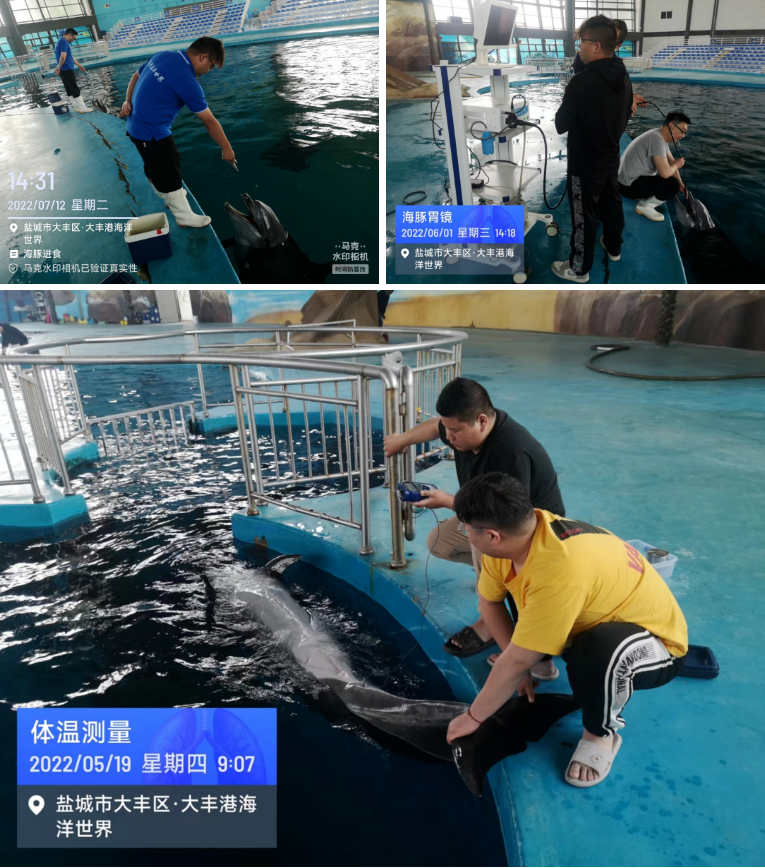 文旅集团海洋世界所饲养的两头海豚,学名日本宽吻瓶鼻海豚,他们来大丰港区已经生活了六年多,已充分适应了这里的环境。在我们驯养团队的精心照料下,快乐地成长。驯养师每天精心准备海豚宝宝喜爱吃的俄罗斯进口的鲱鱼、日本进口的多春鱼以及挪威进口的鱿鱼,一个海豚的日食量达到10公斤。同时每日为其补充各种维生素。我们每天检测他们的体温、用插胃管的方式“饮水”。正常情况下,每月为其全面体检一次,包括采血检验、胃镜检查、呼吸空气采样送检,从而确认他们身体处于健康状态。