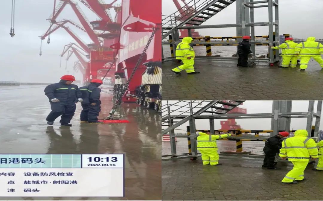 射阳港风电公司第一时间停止码头作业,并加大对码头面的检查力度,逐台检查设备防风装置的完好性,加固门机锚定,及时整改现场检查发现的问题,时刻做好应战准备。