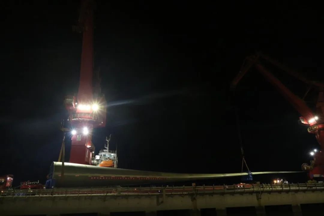“指挥就位”“车辆就位”“装卸就位”“安全员就位”......9月30日晚,在一系列作业准备就绪后,全球最长风电叶片在盐城港射阳港区风电码头成功完成装卸,再度刷新盐城港装卸风电叶片长度新纪录,向党的二十大献上了一份厚礼。