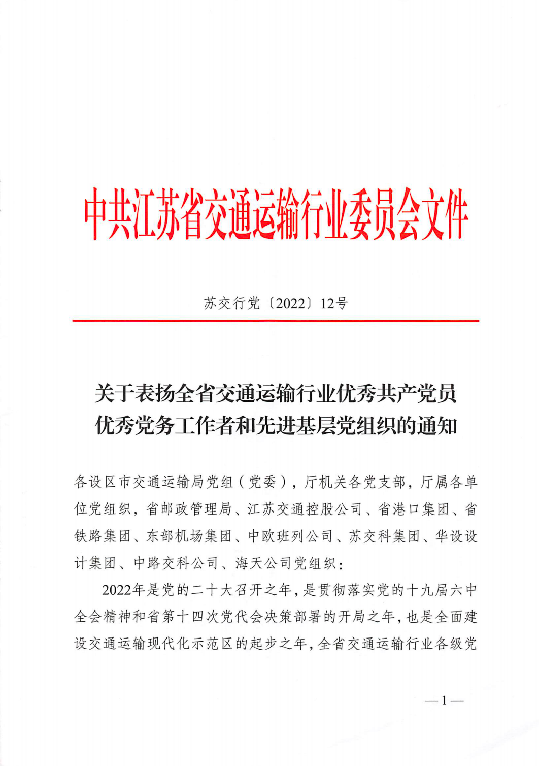 近日,中共江苏省交通运输行业委员会印发通知,对全省交通运输行业优秀共产党员、优秀党务工作者和先进基层党组织进行表扬,江苏盐城港港口有限责任公司党总支荣获“全省交通运输行业先进基层党组织”荣誉称号。