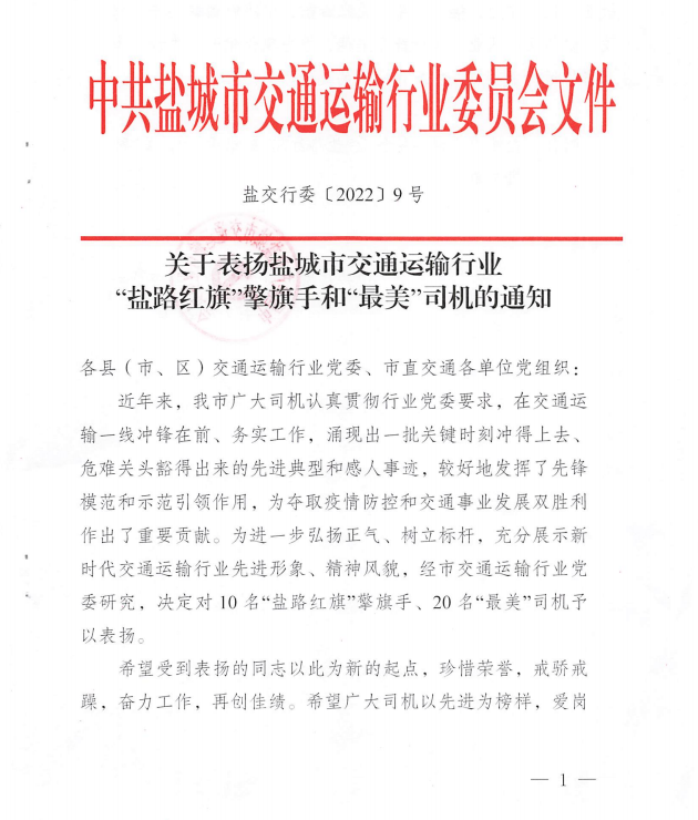 近日,中共盐城市交通运输行业委员会印发《关于表扬盐城市交通运输行业“盐路红旗”擎旗手和“最美”司机的通知》,集团大丰港区王伯亮荣获“盐路红旗”擎旗手荣誉称号,集团响水港区蒋鹤山荣获“最美”司机荣誉称号。