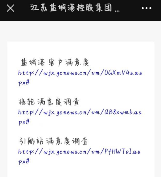 扫描二维码后,选择服务港区进行评价,填写完成后,将出现三个问卷链接:盐城港客户满意度调查、拖轮满意度调查、引航站满意度调查。