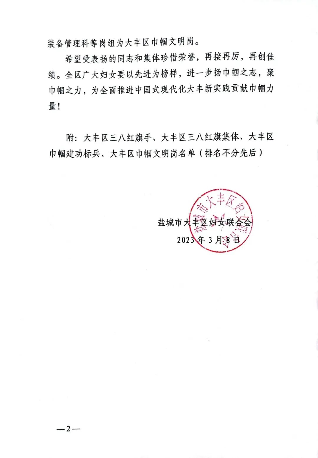 近日,大丰区妇女联合会发表《关于表扬2022年度大丰区三八红旗手(集体)和大丰区巾帼建功标兵、巾帼文明岗的通报》,盐城港大丰港区成品油公司水上加油站“木兰”班组荣获“巾帼文明岗”荣誉称号,班组成员王亚敏荣获“三八红旗手”荣誉称号。