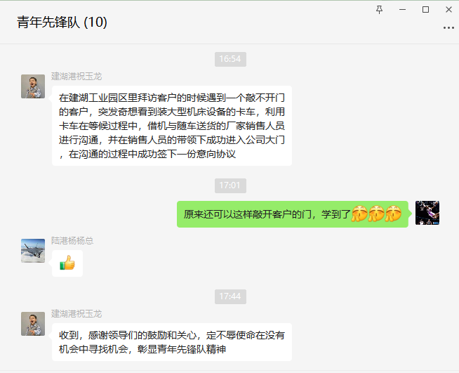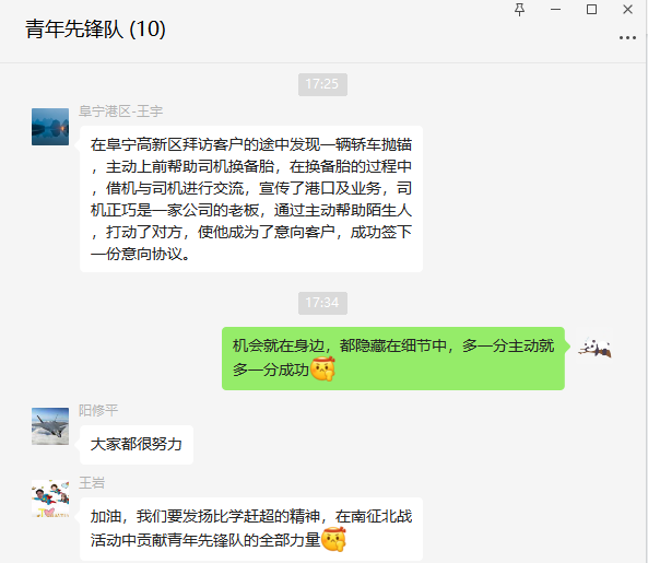 使命催人奋进,实干促人成长。青年先锋队特别注重队员业务能力的持续提升。每周请一位队员在青年先锋队群内分享拜访心得,通过交流互动,不仅掌握了更高效的拜访技巧,还加深了对港口需求趋势的理解。