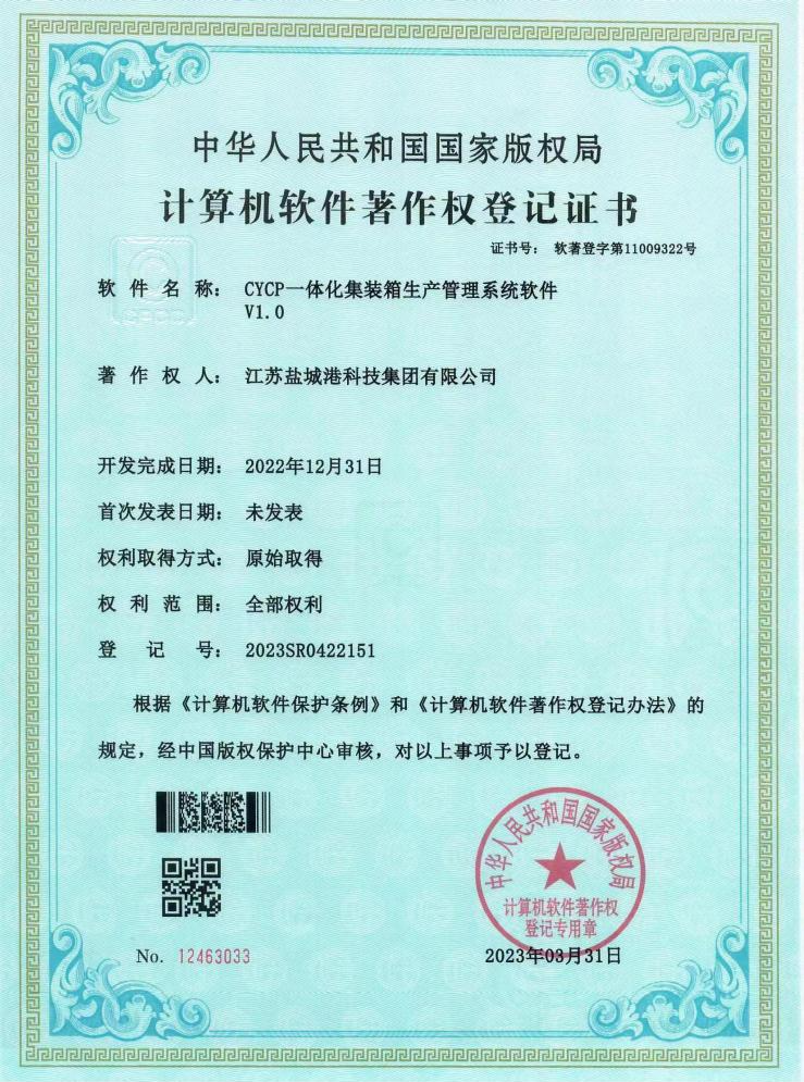 近日,盐城港首个生产管理系统软件“CYCP一体化集装箱生产管理系统软件v1.0”,顺利通过中国版权保护中心审查,正式获得了由国家版权局颁发的软件著作权登记证书。