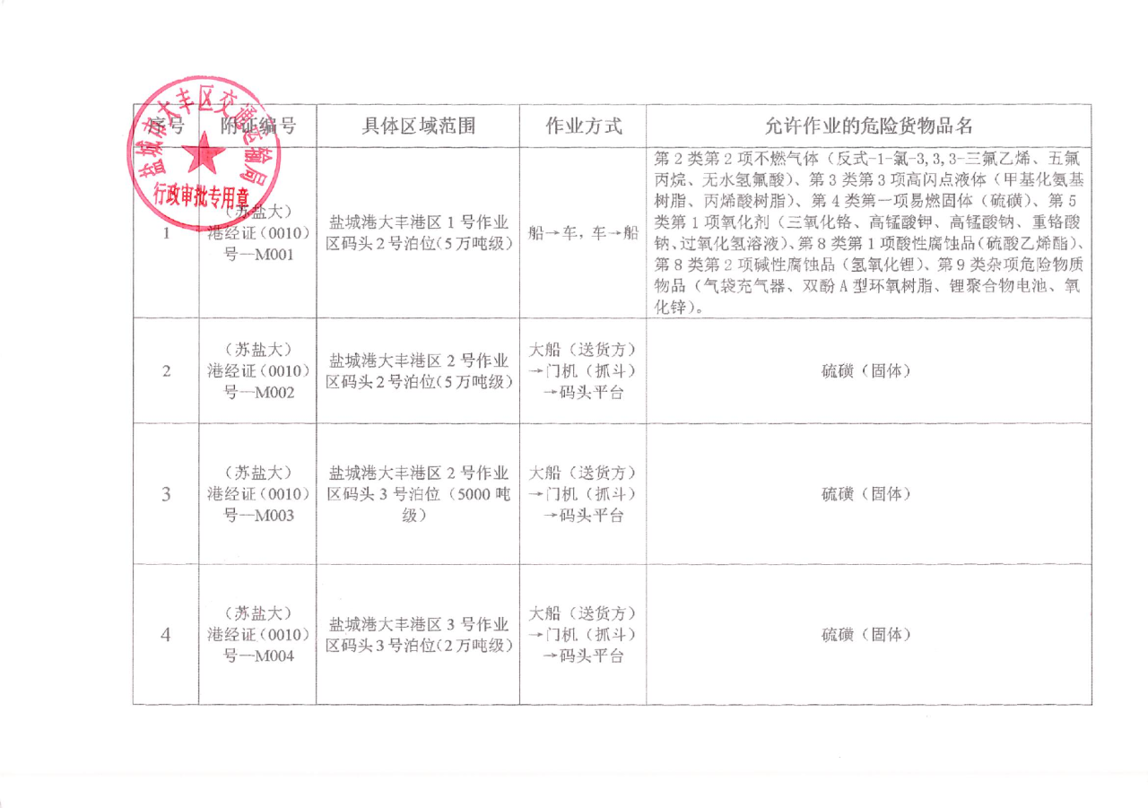 4月27日下午,经交通部门正式批准,盐城港大丰港区集装箱码头顺利取得港口危险货物作业附证,标志着盐城港集装箱产业正式具备危险货物作业能力。