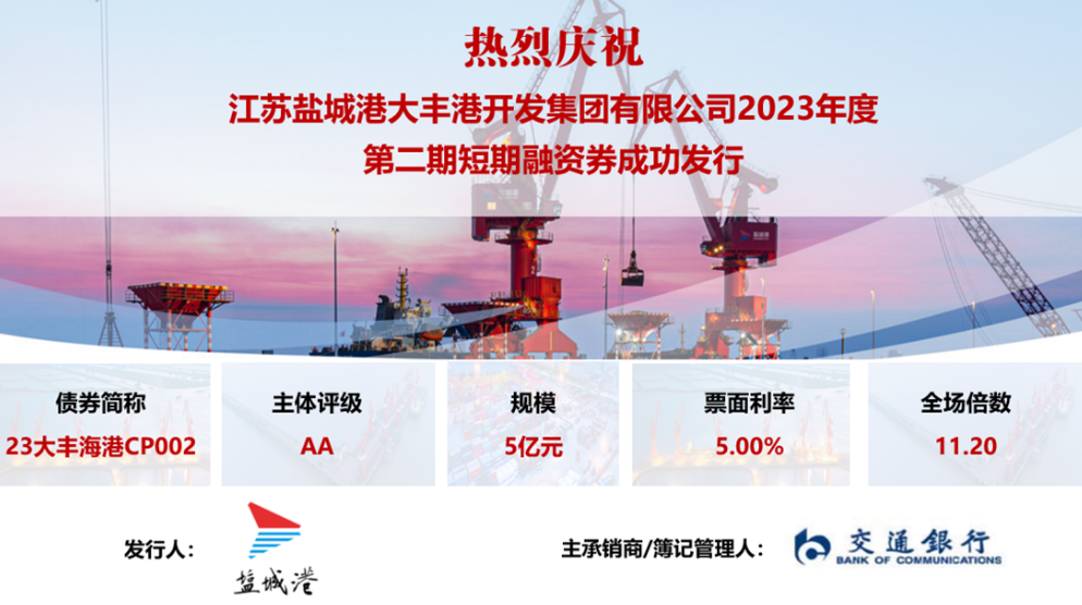 6月29日,大丰港开发集团成功发行2023年度第二期短期融资券,本期短期融资券金额5亿元,发行利率5%,认购倍数11.2倍,创下2023年度盐城地区同一品种申购倍数最高纪录,充分反映了投资机构对盐城港发展的高度认可和信任,也为后续资本市场融资奠定了坚实基础。