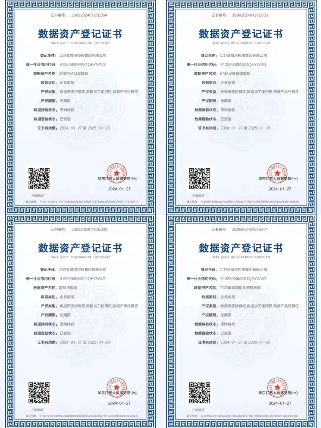 日前,盐城港集团顺利完成集装箱码头生产操作系统(TOS)、电子口岸系统、港机设备物资管理系统(EAM)、散杂货生产管理系统(MES)数据资产质量评价及价值评估,并获得《数据资产登记证书》,成为盐城市首批完成数据资产登记的企业之一,也是全国首个港口企业数据资源入表案例。