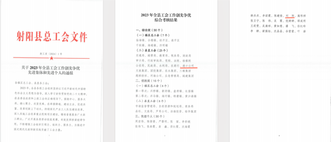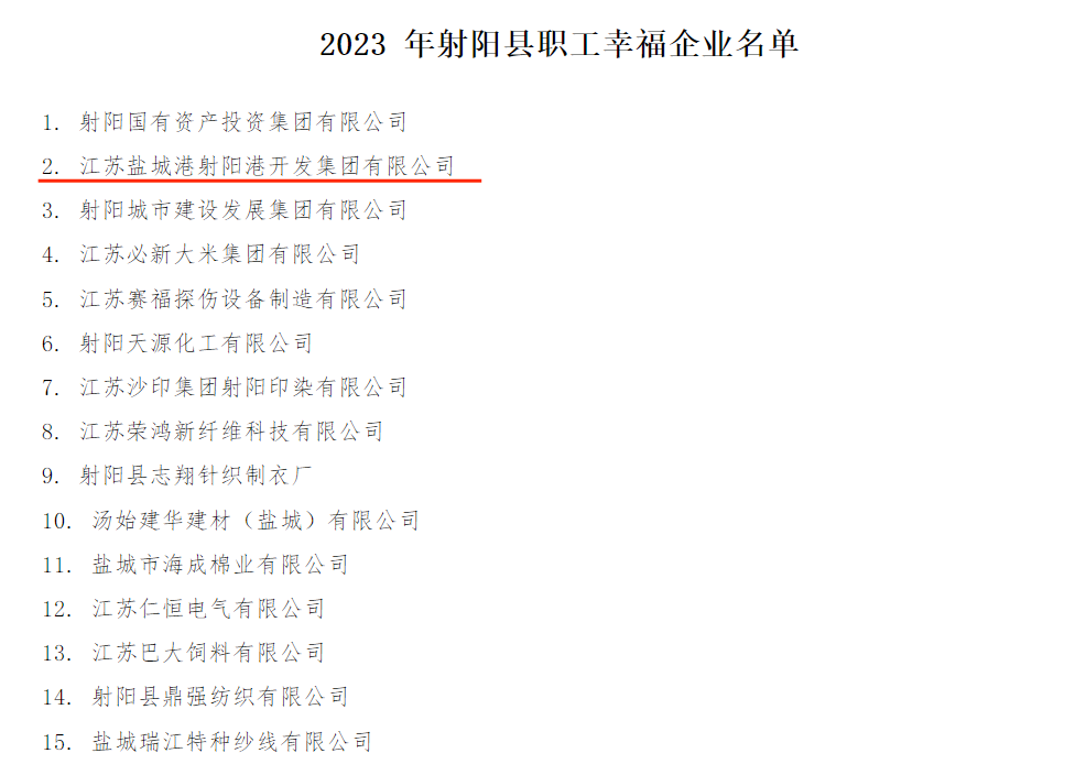 近日,射阳县总工会公示了2023年射阳县“职工幸福企业”名单、县工会工作争先创优综合考核结果,射阳港开发集团榜上有名,再获新荣誉。