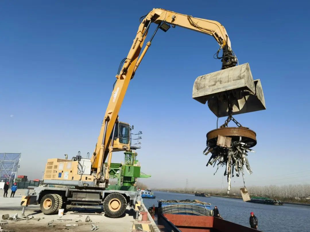 为切实解决作业效率低下的问题,亭湖港区调度组与创新团队多次研究,最终确定使用抓料机作业,同时为防止抓料机抓取废钢对抓斗造成损伤,团队还特别制定抓料机改造方案,通过两根定制钢丝绳将电磁吸盘安装到抓料机抓斗下方,并通过电缆线路改造,抓料机驾驶员可以在驾驶抓料机的同时操控吸盘。由于抓料机的灵活机动,可以自由伸缩抓臂,作业现场不再需要装载机司机的参与。自改造实施后,港区废钢生产作业耗时耗力的难题得到了有效解决,极大地提高了港区生产运营效率,该项改进创新在保证安全的基础上,共节省人工2名,作业时长由4天节省为2天,作业效率提高50%。