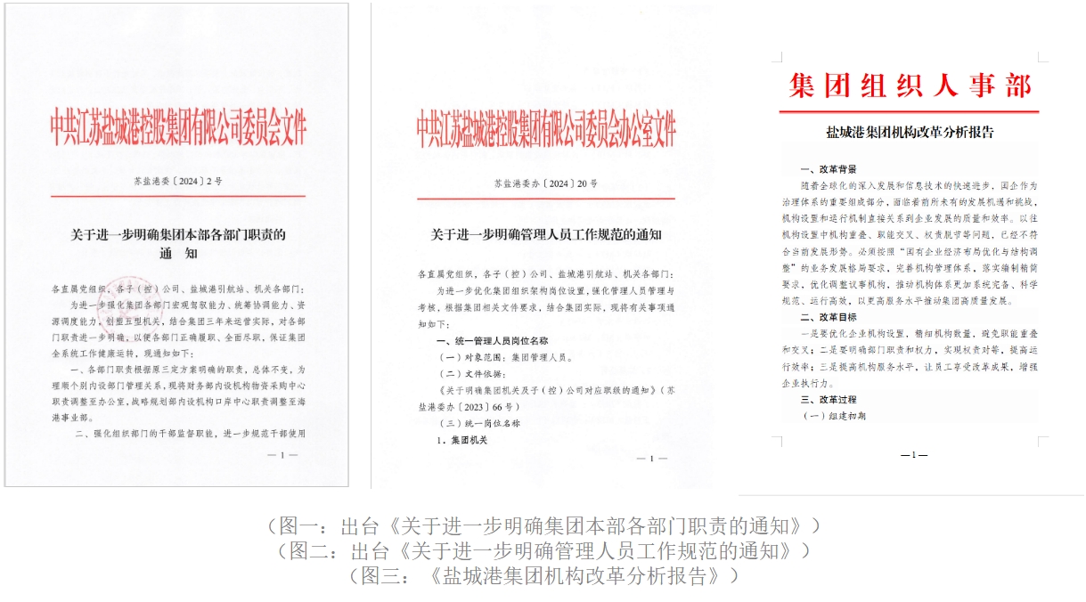 搭建高效化组织架构,优化管理体制。出台《关于进一步明确集团本部各部门职责的通知》《关于进一步明确管理人员工作规范的通知》,科学优化集团组织架构,健全与科学规范要求相适应的机构编制管理体系,推动集团机构职能体系更加系统完备、科学规范、运行高效,明确集团机关及子(控)公司对应职级,统一管理人员岗位名称,进一步规范人员管理。形成《盐城港集团机构改革分析报告》,系统总结盐城港集团成立以来机构改革情况,明确下一步改革工作计划。