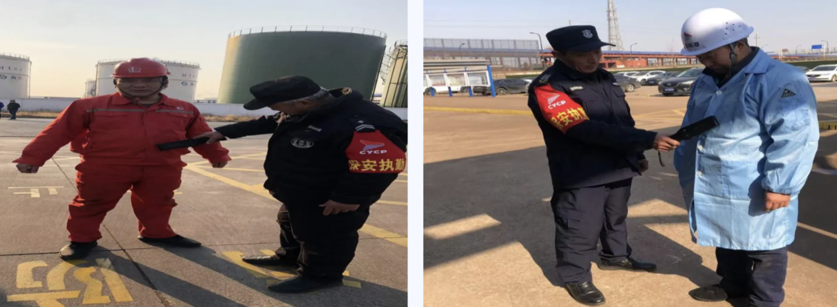 港储石化公司开展进场手机安全管理专项整治行动,门卫通过“金属探测仪”对进场人员是否携带手机进行随机检查,排查重点作业、重点部位、重点人员、重点时段的风险隐患,严格落实现场安全监督和防护措施。