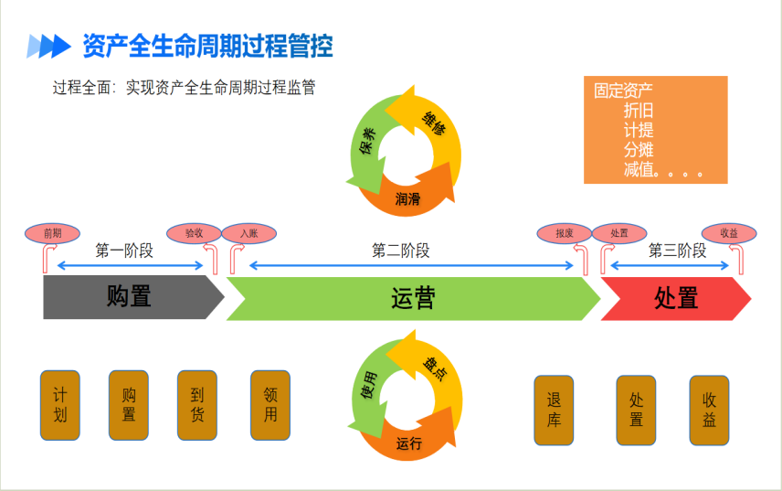 以“完成资产全生命周期管理”为核心,开展各种资产业务管理活动,实现资产从购置、验收、建账立卡到运营、处置的全业务流程监管。针对闲置资产,支持进行内外部共享,搭建资产内外共享平台,撮合内外部资产“供需”,充分盘活闲置资产,提高资产利用率,减少资金耗用。
