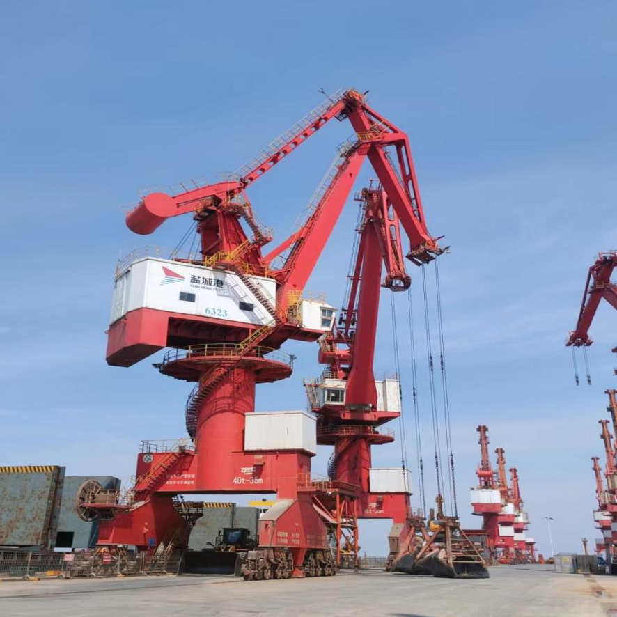 门座式起重机俗称门机,是散杂码头、通用码头最常见的卸船起重设备,也是目前盐城港各港区最常见的起重设备。一般来说,门机负荷有10T、16T、25T、40T四类负荷,目前盐城港门机基本在25T和40T两种。