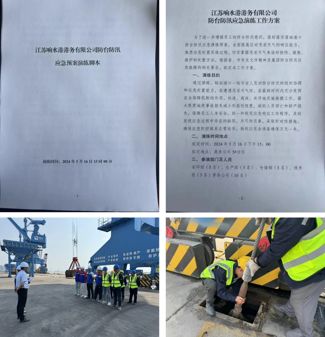 开展现场应急演练。为增强员工防台防汛意识,全面提高应对恶劣天气的应急处置能力和协同配合水平,响水港区开展防台防汛应急演练。演练设置货物转移、电源切断、机械固定、抢险救援、人员撤离等场景,演练现场分工明确、配合默契、处置得当,达到了预期效果,进一步验证了防台防汛应急救援预案的科学性、实用性和可操作性。