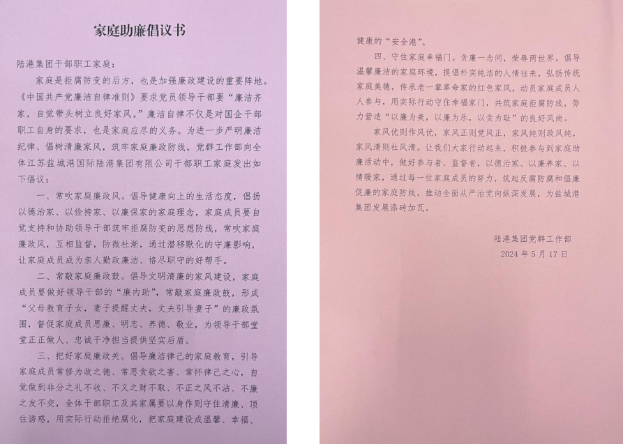 家庭齐心助廉。“为进一步严明廉洁纪律、筑牢家庭廉政防线,党群工作部向全体陆港集团干部职工家庭发出如下倡议……”在警示教育大会上,陆港集团党群工作部向全体干部职工发出了《家庭助廉倡议书》,引导干部职工家属常吹“家庭廉洁风”,做好“家庭廉内助”,把好“家庭廉洁门”,以清廉家风抵御腐败歪风,齐心协力,共同织密“家庭护廉网”。