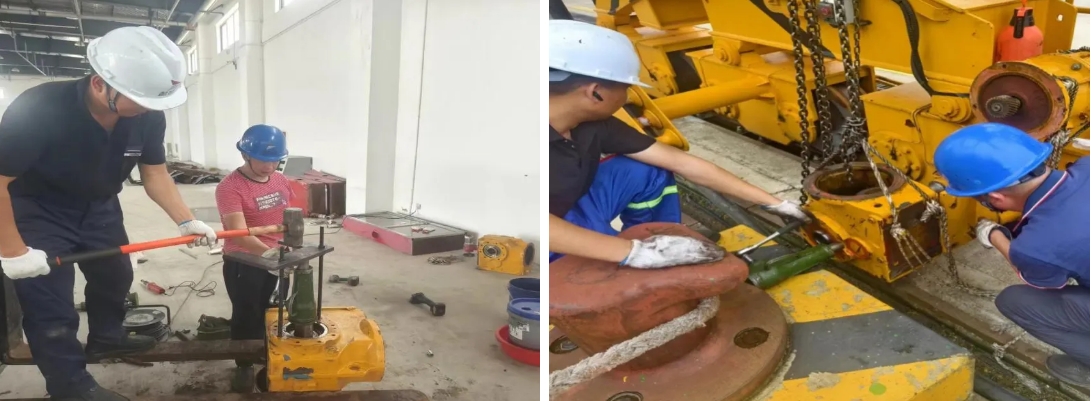 一线现场,总能看到港机公司维保人员忙碌的身影。在接到建湖港区的龙门吊行走减速箱出现故障,需要对设备进行紧急检修的任务后,他们迅速到场排查出故障原因,手持工具边拆卸边检修,尽管挥汗如雨,但他们丝毫不在意,用心保障着港口的每一处机械设备的运转。