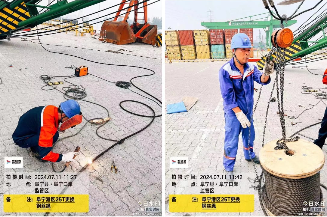 坐标定位:阜宁港区25t固定吊的钢丝绳更换项目现场