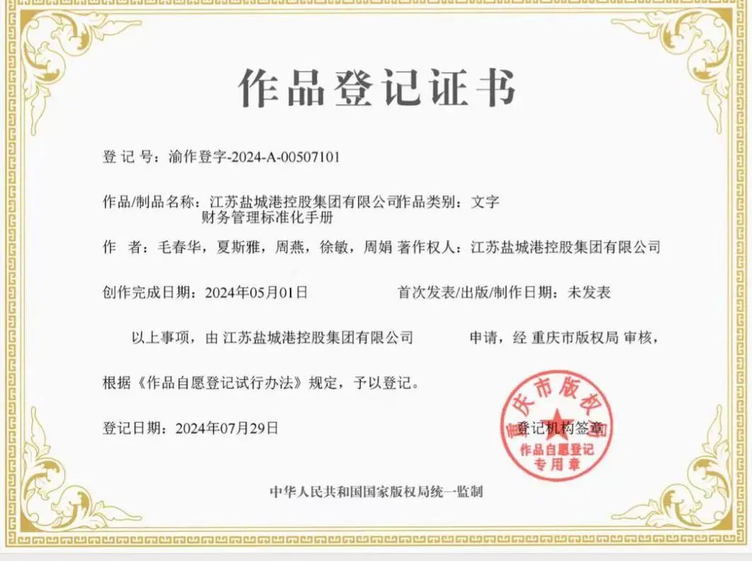 近日,盐城港集团自主编制的《财务管理标准化手册》经过严格审核与认证,成功取得了由国家版权局颁发的作品登记证书。这不仅是集团在财务精细化管理方面的积极探索,也是集团对财务管理标准化的创新实践。
