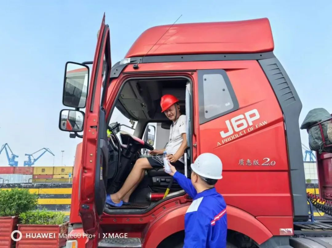 虽已入秋,码头高温不减。一辆辆卡车排列在码头,静静等待土石装卸运输指令,卡车司机也一同经历着高温的考验。为确保卡车司机们的安全与健康,保障运输不断档,港区派专人为司机送去矿泉水等清凉物资,并叮嘱他们行车前要仔细检查车况,注意驾驶安全,预防高温中暑和各类安全事故发生。货车司机们纷纷表示,这样的关怀让他们感受到了丝丝凉意和满满温情。