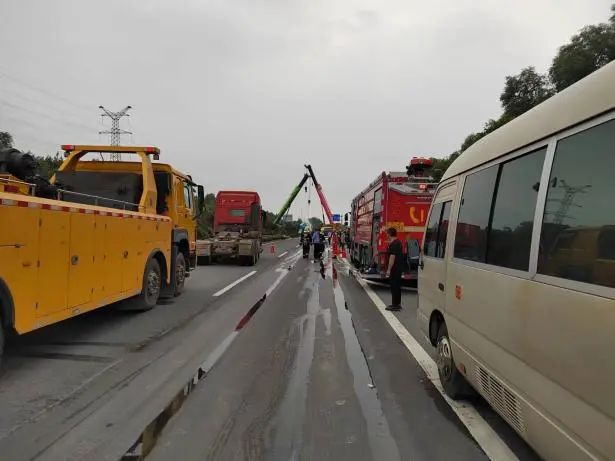 根据现场险情,公安交警部门第一时间封锁事故现场,禁止一切车辆靠近,消防大队出动消防车对事故车辆罐体进行喷射冷却,联系吊车对其进行罐体扶正工作,随后由危化品运输公司救援抢险队使用相关设备将泄漏罐车内的“高沸点芳烃”进行抽取,并转移至指定安全区域。