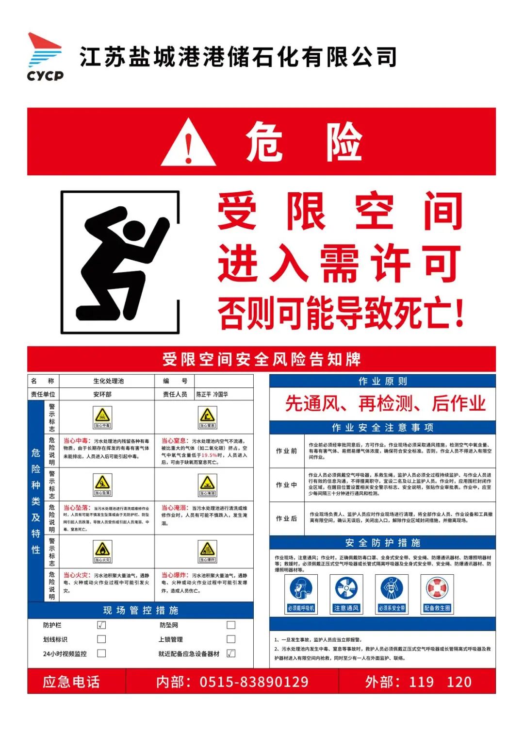 作业现场必须配备呼吸器、通讯器材、安全绳索等防护设施和应急装备。作业现场必须配备监护人员,与作业人员有效沟通,方便及时实施救助。