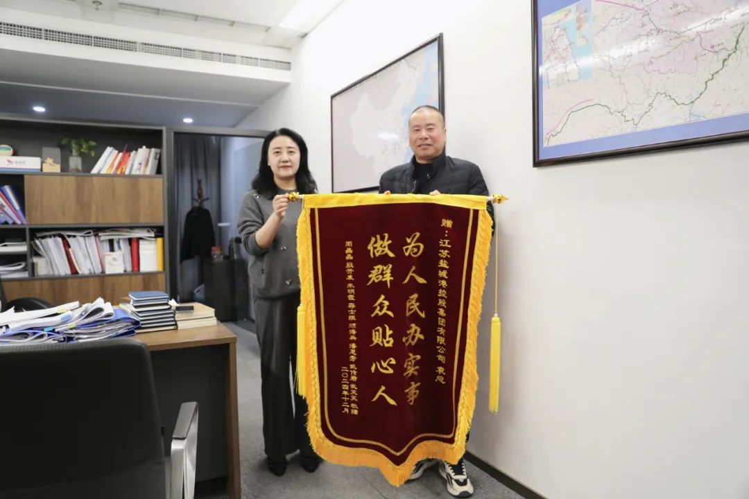 12月24日,多名群众自发将一面写有“为人民办实事 做群众贴心人”的锦旗送到盐城港集团,感谢盐城港集团副总经理袁欣带领团队帮助民众解难题、办实事。