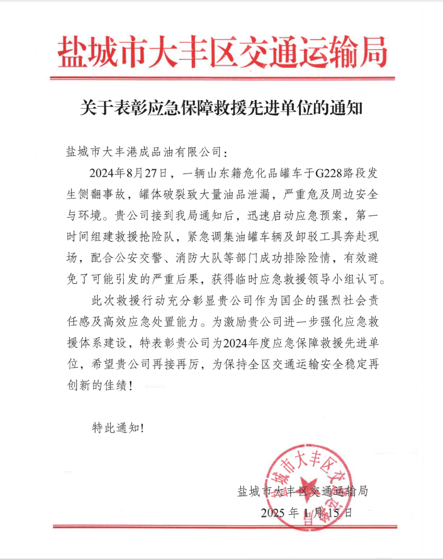 近日,盐城市大丰区交通运输局将一份“2024年度应急保障救援先进单位”荣誉证书颁发给成品油公司,以表彰该公司在2024年8月的一次应急救援行动中,展现的卓越的应急响应能力和高度的社会责任感。