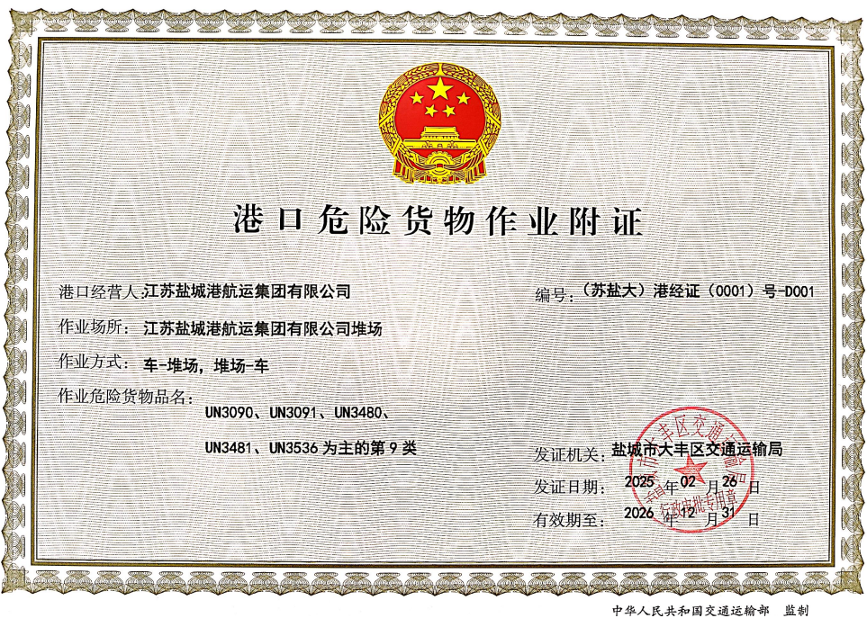 此次盐城港园林式危货堆场获批“双证”,是盐城港集团致力于“五新示范港”建设过程中的重要里程碑,意味着盐城港可开展UN3090、UN3091、NU3480、UN3481、UN3536为主的第9类货种的集装箱仓储物流业务,同时还优化了港口营商环境,是更好地服务腹地企业的有力举措,预计可为企业降低近1500元/箱的物流成本,同比降幅近30%,有利于吸引更多的新能源企业入驻,打响盐城港特色仓储物流品牌,增强核心竞争力。