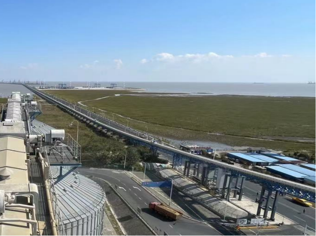 蓝色的全封闭式散粮输送机连接天与海,从码头延伸至粮食筒仓,远远看去,宛若一条水龙,盘旋缠绕在仓顶。在自动化控制系统的加持下,粮食运输的流量和方向精准无误,智能化作业效率提档加速,人工成本和粉尘污染不断减少,输送损耗率下降至零,俨然成为粮食高效运作的“主力军”。