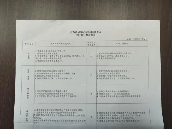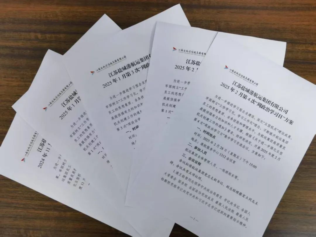 坚持每周一召开工作例会,学习盐城港集团党委会“第一议题”相关文件、研究交办事项完成情况及近期重点工作任务推进情况。采用“三言两语”汇报机制,各部门(单位)负责人逐一汇报重点工作完成情况及本周工作计划,分管领导补充完善,主要领导结合集团党委部署,围绕航运集团发展实际,就重点工作事项再部署、再强调,进一步提高思想认识,增强做好当前各项重点工作的责任感和紧迫感,牢固树立“一盘棋”思想,夯实工作责任,细化工作举措,确保有序推进。
