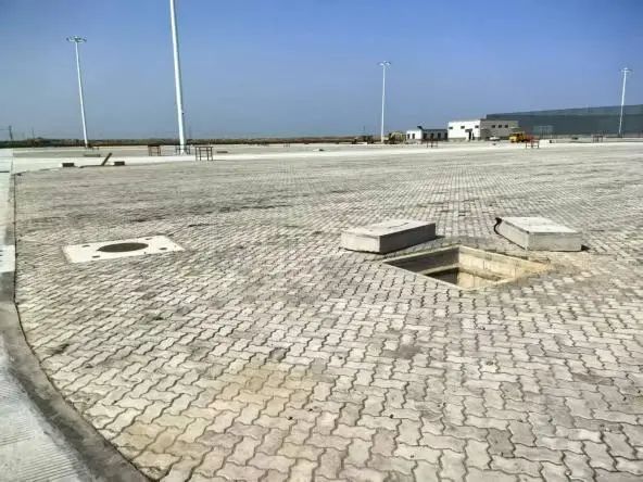 堆场区域,1处方形电力井盖因施工疏忽未恢复井盖,且未设置警示反光标识,存在人员坠落风险。