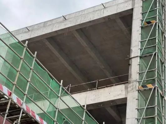 混凝土结构施工区域,浅棕色木方违规倾斜堆放于临边围挡处,遇外力(如碰撞、大风)易发生坠落,威胁下方作业人员安全。