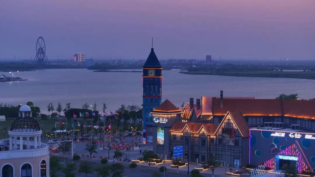 “蓝调时刻”的魅力,在于它的短暂与永恒共生。当最后一缕天光消失,港区并未沉入黑暗——龙门吊的警示灯如红色萤火,港泊文旅上演着精彩的灯光秀,把跨境电商商贸小镇变成了一幅赛博朋克风格的数字画卷。