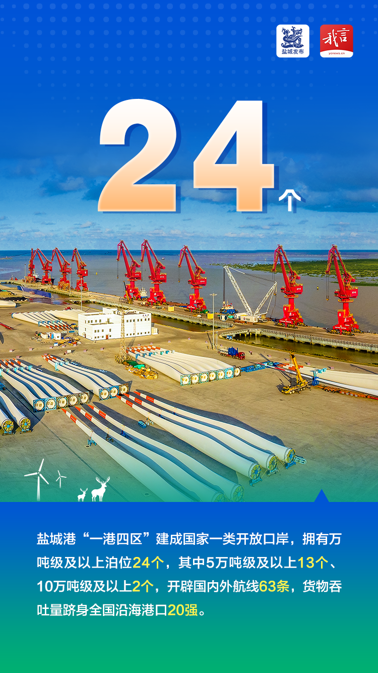5年来,盐城港“一港四区”建成国家一类开放口岸,拥有万吨级及以上泊位24个,其中5万吨级及以上13个、10万吨级及以上2个,开辟国内外航线63条,货物吞吐量跻身全国沿海港口20强。