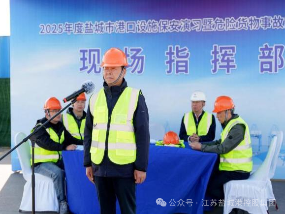 演练开始前,盐城港集团党委委员、副总经理丁安广作动员讲话。演练结束后,现场总指挥、盐城市交通运输局副局长丁胜宣布应急响应终止,并作总结讲话。他指出,此次演练有效检验了全市港口设施保安与危险货物事故应急预案的科学性和实用性,锻炼了应急救援队伍的实战能力,提升了跨部门、跨层级的协同处置水平。他强调,要以此次演练为契机,进一步查找不足、完善机制、压实责任,持续提升港口安全保障能力和应急管理水平,为盐城港航事业高质量发展筑牢坚实安全屏障。