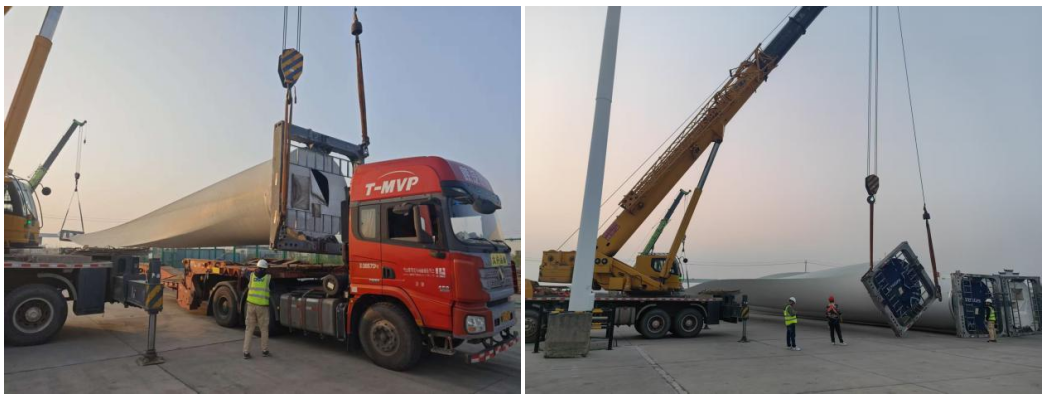 “百日攻坚”号角吹响以来,盐城港保税物流中心主动聚焦重大件货物物流服务痛点难点,将风电叶片入库作业列为重点攻坚任务。筹备阶段,中心组建专项攻坚小组,综合研判运输衔接、场地调度、机械适配等多维度因素,制定“一货一策”详尽作业方案,对流程节点逐一梳理、闭环解决;同步协调管委会、海关等职能部门,针对风电叶片运输道路通行需求,通过拆除影响通行的路灯等举措保障道路通畅,进一步优化作业保障体系;搭建分工明确、协同高效的作业团队,提供全程精细化服务。针对风电叶片“超长、超重”的特性,中心专项开展安全操作集中培训,明确岗位职责、规范统一指挥流程,强化安全技术交底与风险点辨识控制,全方位筑牢大件作业安全防线,以专业能力为攻坚任务保驾护航。