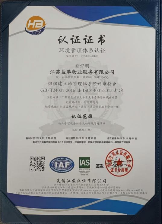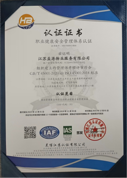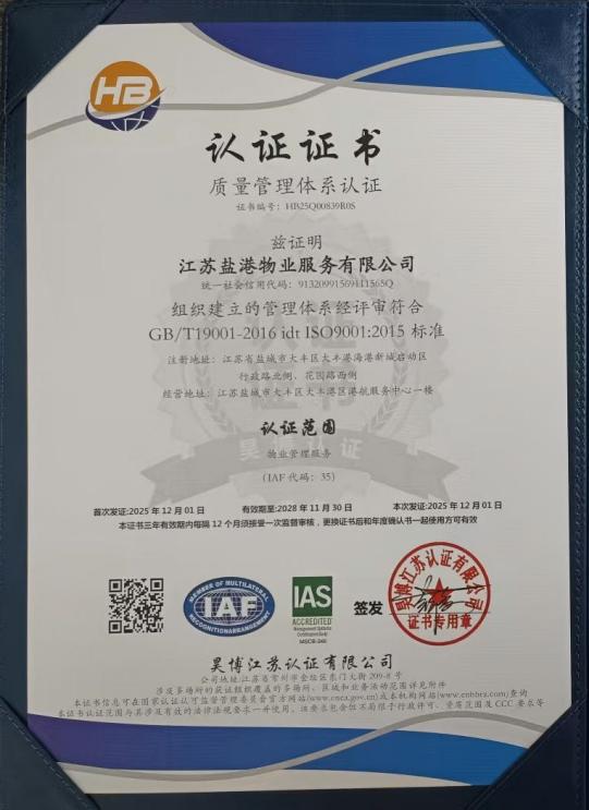 作为盐城港集团的物业管理企业,盐港物业始终秉持“客户至上、精益求精、责任担当” 的核心价值观,专注于为综合体办公楼、住宅小区等各类物业项目提供全方位、高品质的物业服务。此次认证过程中,审核机构依据 ISO 相关国际标准,对公司的管理体系进行了全流程、多维度的严苛评审,涵盖制度建设、流程执行、风险管控、服务质量、环境治理、员工权益保障、社会责任履行等多个关键环节。通过查阅资料、现场核查、人员访谈等多种方式的全面检验,盐港物业的管理体系因其完整性、合规性、有效性得到了审核专家的高度认可,最终顺利通过全部认证。