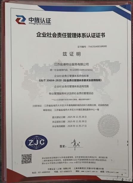 近日,盐港物业成功通过ISO系列管理体系认证,获得诚信管理体系、环境管理体系、职业健康安全管理体系、质量管理体系、企业社会责任管理体系五项核心认证证书,标志着盐港物业在规范化运营、服务品质提升、社会责任践行等多个维度实现全面升级,正式迈入标准化、精细化管理的新阶段。