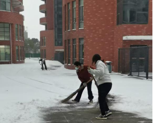 持续雨雪冰冻天气,气温骤降至零下,道路积雪结冰给群众出行和校园安全带来严峻考验。盐港物业第一时间响应,在居民小区,工作人员顶风冒寒,手持铁锹、扫帚在晨光熹微中集结,分工协作清扫楼门通道、地下车库坡道等关键区域。物业客服、保洁部门的女员工组成“巾帼除雪队”,清扫积雪后及时撒布融雪盐,用“巾帼不让须眉”的担当守护每一位业主的出行安全。面对业主车辆打滑被困的突发状况,工作人员火速上前,清扫冰雪、指挥调度,默契配合帮助车辆成功脱困,用及时援手传递服务温度。