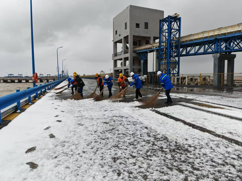 保税物流中心领导班子靠前指挥,提前备足工业盐等防冻融雪物资,组织全体干部职工开展铲雪除冰行动。大家不畏严寒、分工有序,重点清扫场区主干道、物流出入口、停车场等关键区域,党员干部冲锋在前,青年职工奋勇担当,经过数小时连续作业,彻底清除主要通行区域积雪积冰,有力保障了物流车辆畅通与生产作业有序运行。滨海港区各单位更是多点发力,投资公司优化作业流程和行车路线,设立现场管理员科学调度;港务公司与客户高效联动,保障货源供应链畅通;物流公司聚焦技术攻坚、市场拓展和人才培养,在寒冬中积蓄发展动能。