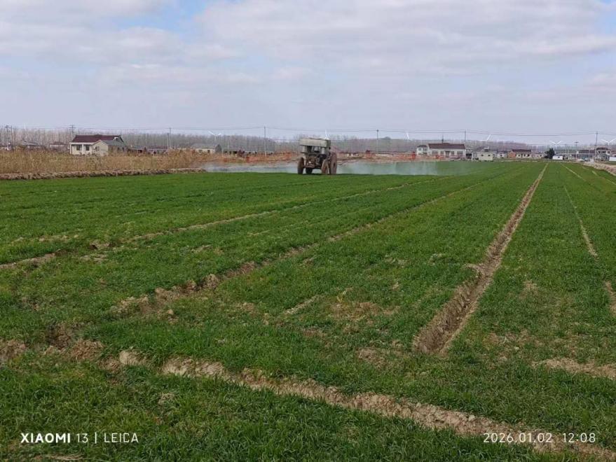 针对当前二麦、油白菜长势不均衡的突出问题,金色农业坚持“人防为先、精准施策”,组织农技人员分片包联、下沉田间,逐地块排查苗情、墒情,因地制宜制定差异化管护方案,扎实推进抗旱补肥、促弱转壮等关键技术措施落地见效。对仍处于“土里捂”状态、未出苗或出苗不齐,且表墒偏旱的田块,抢抓日间气温回升的适宜时机,组织人工配合机械开展喷灌、沟灌洇水作业,匀速补水、适度增墒,全力促进作物出苗齐、长势匀;对3叶以下、表墒偏旱的麦田、菜田,在精准灌溉的基础上,同步补施尿素或叶面喷施补氮制剂,快速补充养分、缓解旱情,助力弱苗提势;对4-6叶期、群体偏大的田块,精准开展化控调控,搭配喷施磷钾肥,有效抑制无效分蘖、促进健壮生长,为在田作物平衡长势、安全越冬筑牢坚实基础。