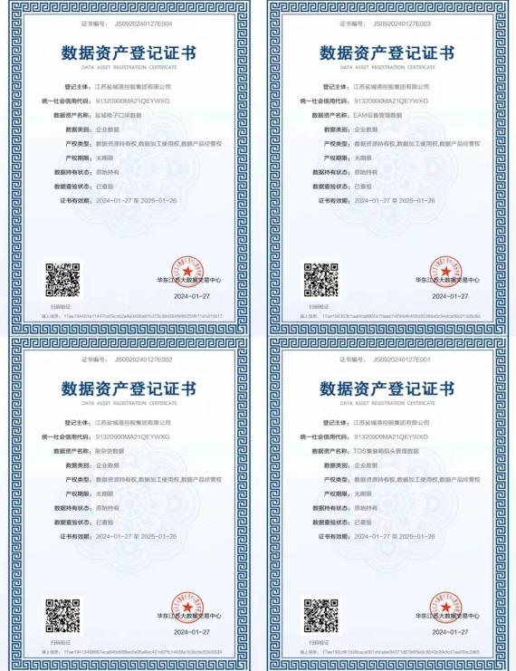 在科技创新引领下,“十四五”期间,盐城港集团智慧港口建设成效显著。大内网、主数据中心建成运行,7个一体化内控信息化系统陆续上线,稳固跨港区协同管理的技术根基。一体化集装箱、散杂货生产管理系统全面铺开,综合作业效率提升5%以上。电子口岸平台整合多元服务功能,业务办理时间平均缩短30%。去年推出的网上营业厅,以一站式在线服务实现“数据多跑路、客户少跑腿”。值得一提的是,集团顺利完成电子口岸平台等系统的数据资产质量评价与价值评估,获得《数据资产登记证书》,成为盐城市首批完成数据资产登记的企业,为行业数字化转型提供了可复制的实践样本。