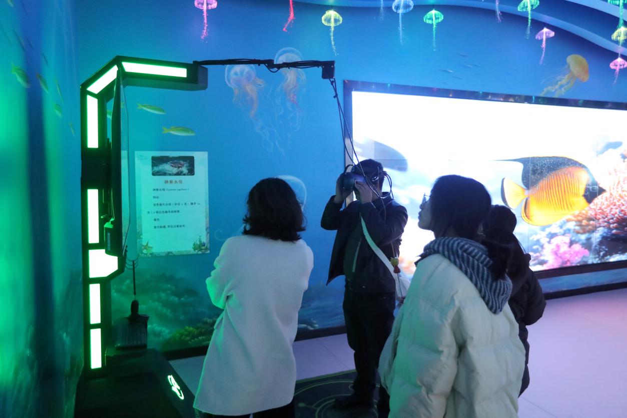 在大丰港海洋世界,港泊文旅精心打造的科技互动体验区热闹非凡。这里运用 AR、VR 等现代科技,构建出逼真的海洋场景。游客们仿佛置身海底,探秘海洋奥秘,与虚拟动漫角色亲密互动。一个小朋友拉着妈妈,指着科普大屏幕兴奋地大喊:“妈妈,原来荧光海是这样形成的!”脸上满是惊奇与喜悦。