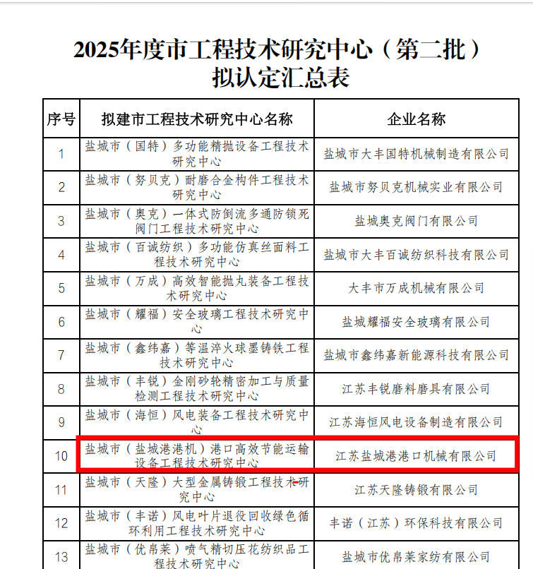 锚定创新,常抓不懈,顺利通过盐城市关于成立盐城港港口机械有限公司港口高效节能运输研究中心评审。港机公司始终坚持技术引领的工作理念,近期大丰区科技局对2025年度大丰区省(市)级工程技术研究中心进行了认定和绩效考评,港机公司设立的盐城市(盐城港港机)港口高效节能运输研究中心顺利通过了评审。公司研究中心评审的通过是对港机公司技术团队在港口货物高效运输、运输装备的势能回收以及港机智能安全防护等方面的研发成绩的肯定,更是对港机公司未来各项创新的鞭策与要求,有效推动理论向成果的转化。