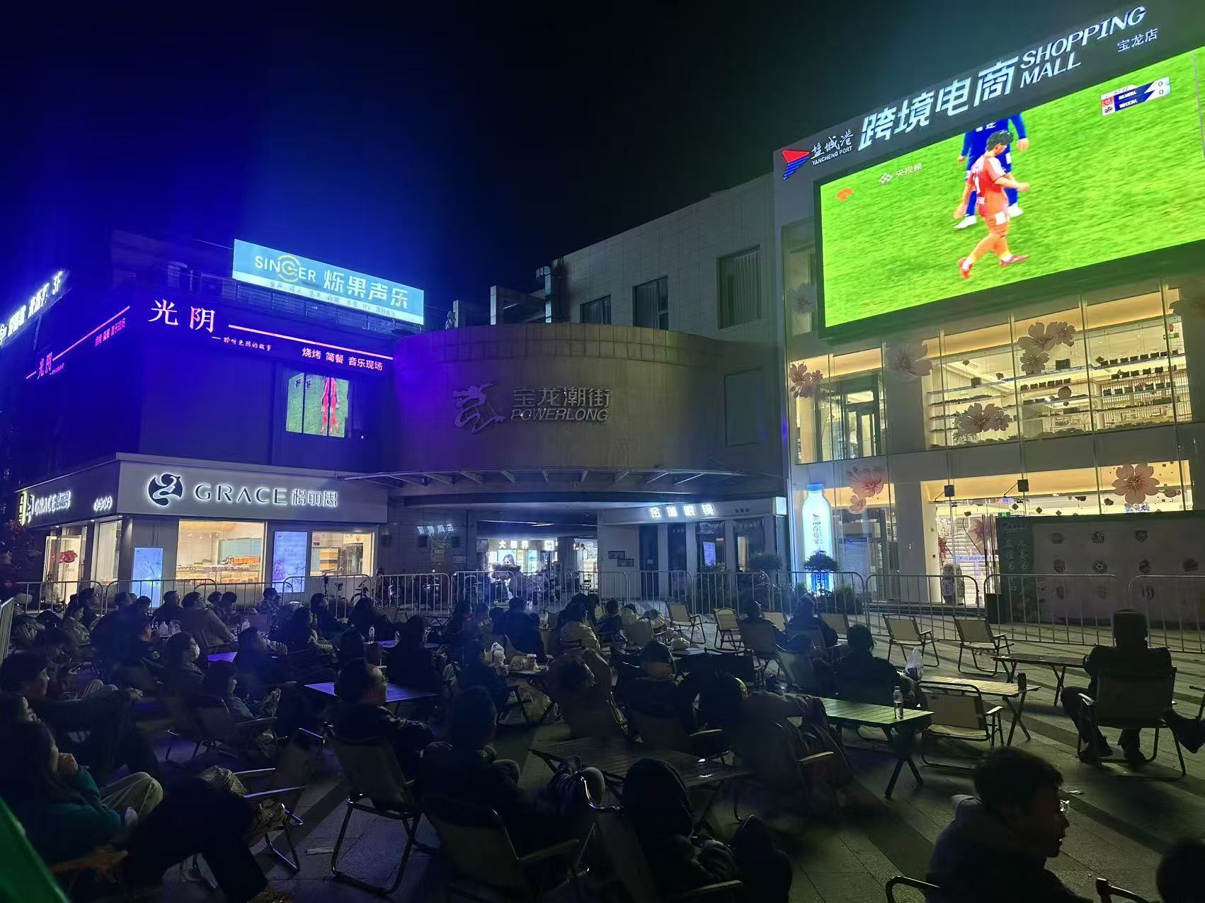与此同时,盐城港跨境电商宝龙店的“第二现场”同样热闹非凡。众多未能抢到奥体中心入场门票的球迷早早聚集于此,通过设置在店外的大型电子屏同步观看盐城队与宿迁队的精彩对决。露天观赛区人头攒动,球迷们或坐或立,目光紧锁大屏,生怕错过场上每一个精彩瞬间。现场还特别设置了苏超主题投票墙,球迷们纷纷为自己支持的球队和球员投下热情一票,互动氛围愈加热烈。中场休息期间,门店导购人员推着小推车穿梭于观众席间,将精选的跨境零食、饮品等商品送到球迷手边,不少观众趁着比赛间隙选购,将观赛的热情延续到了即时消费之中。