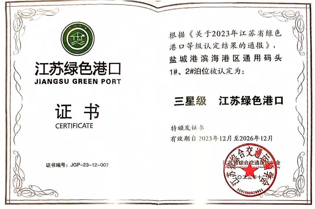 滨海港区获得“江苏省三星级绿色港口”荣誉称号