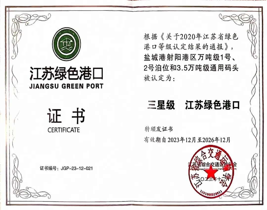 射阳港区获得“江苏省三星级绿色港口”荣誉称号