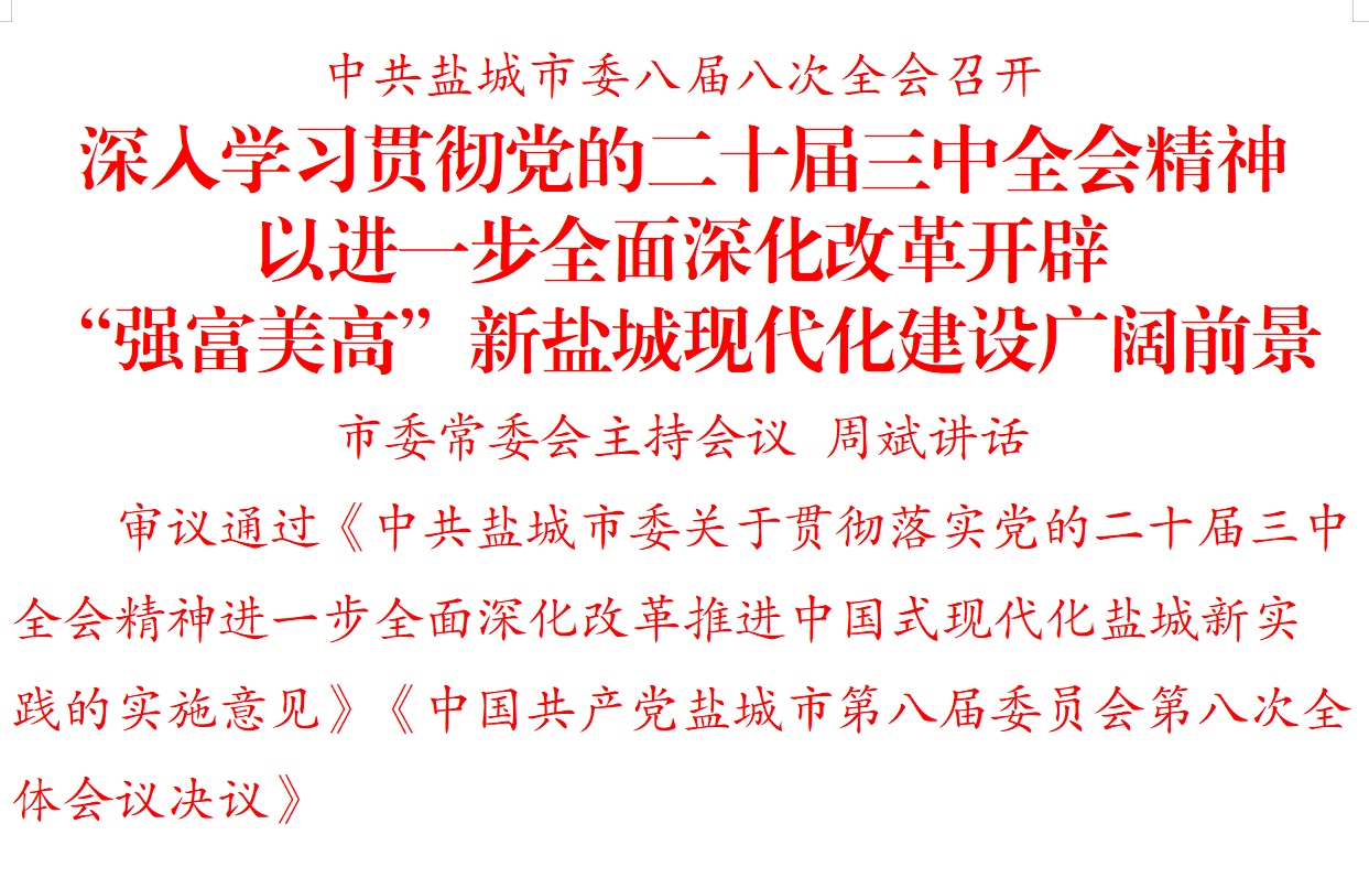 全会审议通过《中共盐城市委关于贯彻落实党的二十届三中全会精神进一步全面深化改革推进中国式现代化盐城新实践的实施意见》《中国共产党盐城市第八届委员会第八次全体会议决议》。